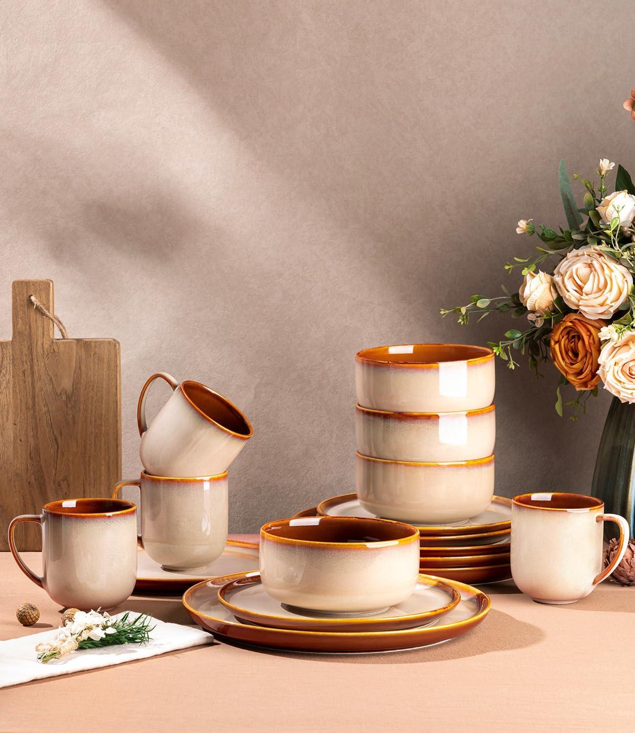 【 ELEGANT AND STYLISH DESIGN 】This dinnerware sets leads the dining trend with its expressive colors and finishes. With its vibrant color palette and captivating finishes, it creates an alluring ambiance that exudes warmth. The eye-catching reactive glazes and rich, vivid hues not only soothe the senses but also elevate your dining experience. The generously-sized plates provide ample space for displaying your delectable creations, while their deep bottoms prevent any sauce from spilling over.