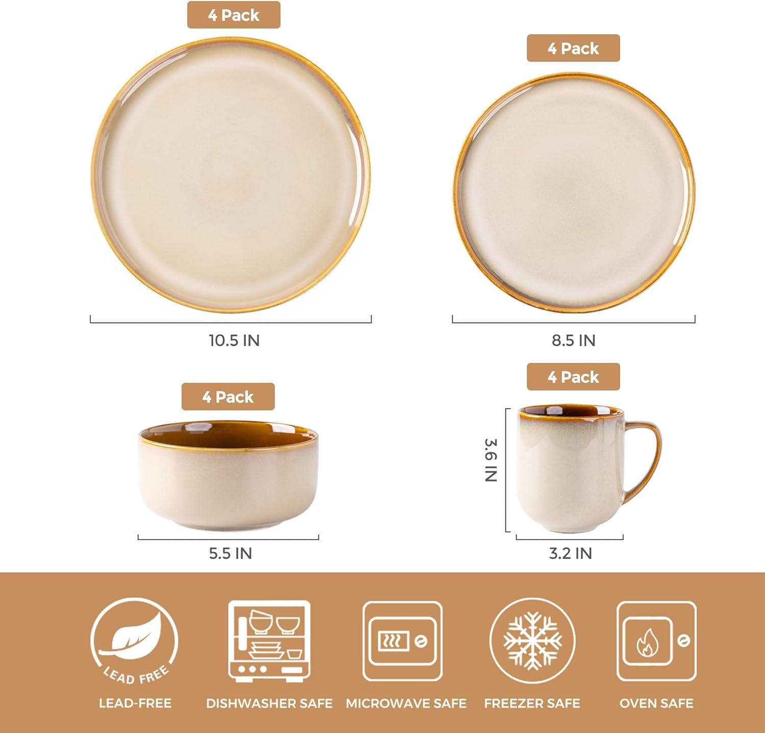 【WHAT YOU WILL RECEIVE】 This 12-piece dinnerware set includes 4 x 10.5-inch dinner plates, 4 x 8.25-inch salad plates, and 4 x 24 oz cereal bowls. Ideal for small families, couples, or individuals, this set perfectly meets all your dining needs with four complete place settings.